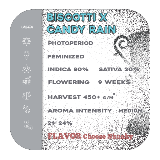 Biscotti – a dessert strain by the renowned breeder Jigga (Jai Chang) and Cookies Fam. This strain became famous for its biscuit-like aroma, dense buds, and potent effects.