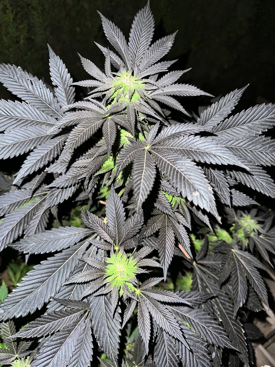 The strain’s resin production is visible to the naked eye, with thick white trichomes creating a stark contrast against the dark buds.