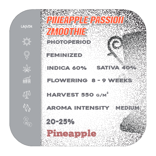 Pineapple Passion, also known as “Pineapple Passion Zmoothie,” is a slightly indica-dominant hybrid strain (60% indica / 40% sativa) created by crossing the flavorful Pineapple Passion Zkittlez and Passion Zmoothie strains.